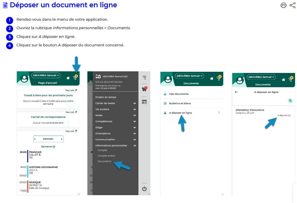 Afin de faciliter la gestion des documents à collecter (assurances scolaires, attestation JDC, justificatif de domicile lors d'un déménagement), le secrétariat via Pronote vous demande de déposer un document, vous recevez une alerte et des relances.